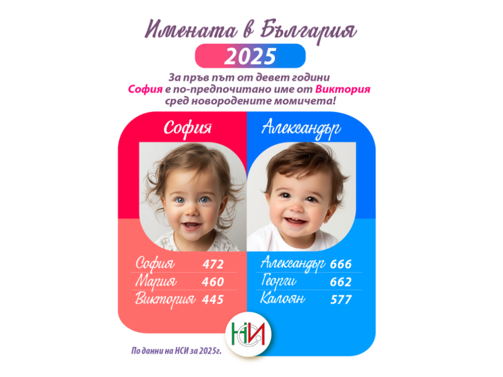 В топ 10 на любимите имена за момичета през 2025 г. са София, Мария, Виктория, Рая, Никол, Дария, Габриела, Елена, Александра и Михаела.