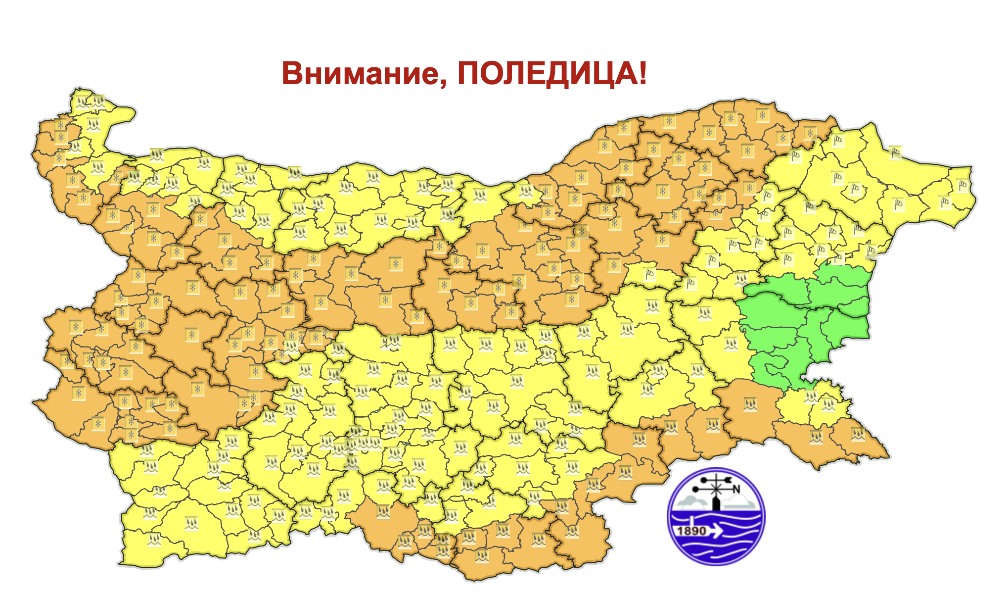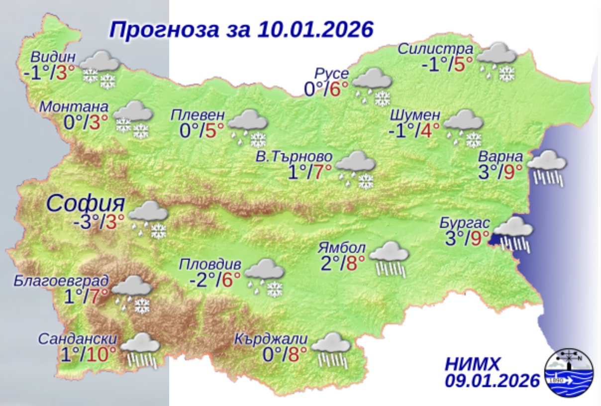 Днес ще бъде облачно с валежи. Сутринта на много места в Западна и Южна България ще вали дъжд и сняг и главно в Северозападна България, високите полета на Югозападна и районите около Средна Гора ще има условия за поледици.