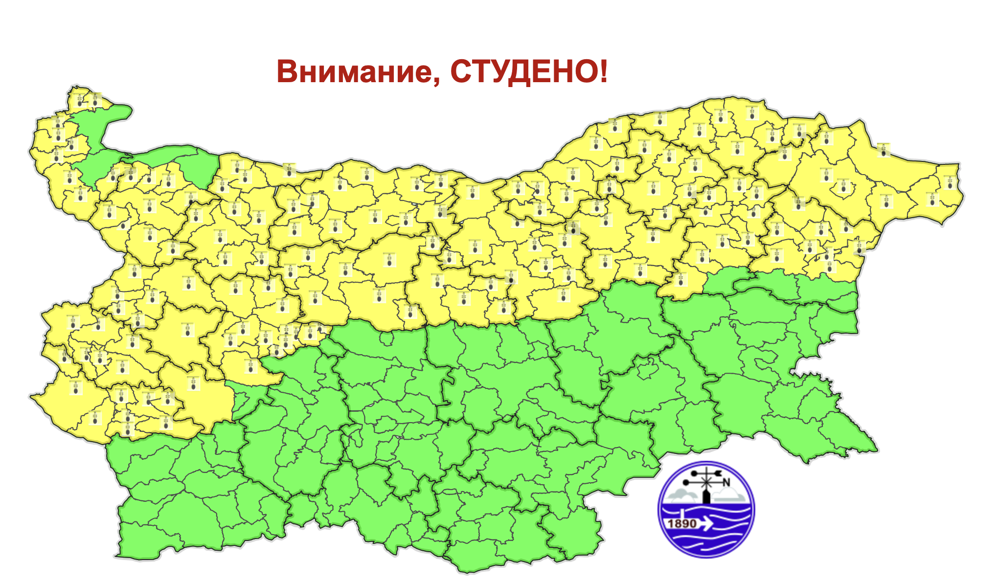 Днес облачността над страната ще е променлива, над много райони намаляваща до незначителна. Ще остане ветровито с умерен, в Северна България, по долината на Струма и в западната част на Горнотракийската низина и временно силен северозападен вятър. Максималните температури в по-голямата част от страната ще останат отрицателни, между минус 6° и минус 1°, в София – около минус 5°. В Горнотракийската низина и крайните югозападни райони максималните температури ще са малко над нулата.