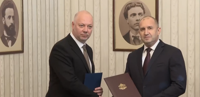 „Групата на ГЕРБ-СДС със свое протоколно решение определи да дойда днес в изпълнение на повелите на конституцията и като определен от парламентарната група кандидат за министър-председател да получа първия проучвателен мандат“, каза Желязков и му подаде документът с решението на парламентарната група. Радев веднага му връчи мандата.