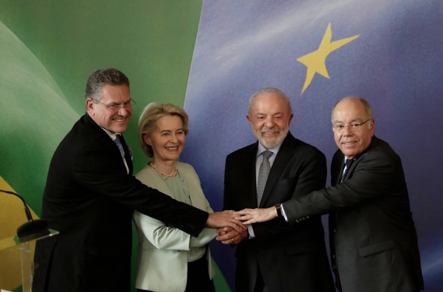 Преди да отпътуват за церемонията, председателят на Европейската комисия Урсула фон дер Лайен и еврокомисарят за търговията Марош Шефчович първо посетиха Бразилия, чийто президент Лула да Силва има ключова роля за споразумението.
