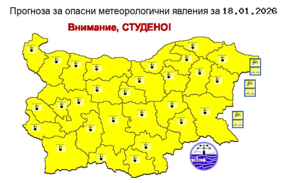 За цялата страна е в сила жълт код за студено време в неделя, а по Черноморието студът ще бъде придружен от силен вятър.