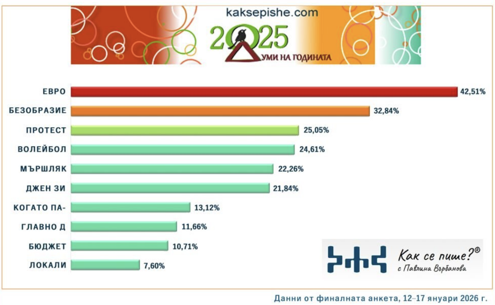 С близо 33% на второ място е думата „безобразие“, която произлезе от парламентарни обсъждания, а с около 25% одобрение са думите „протест“ и „волейбол“, сочи още петото годишно проучване на „Как се пише ?“.
