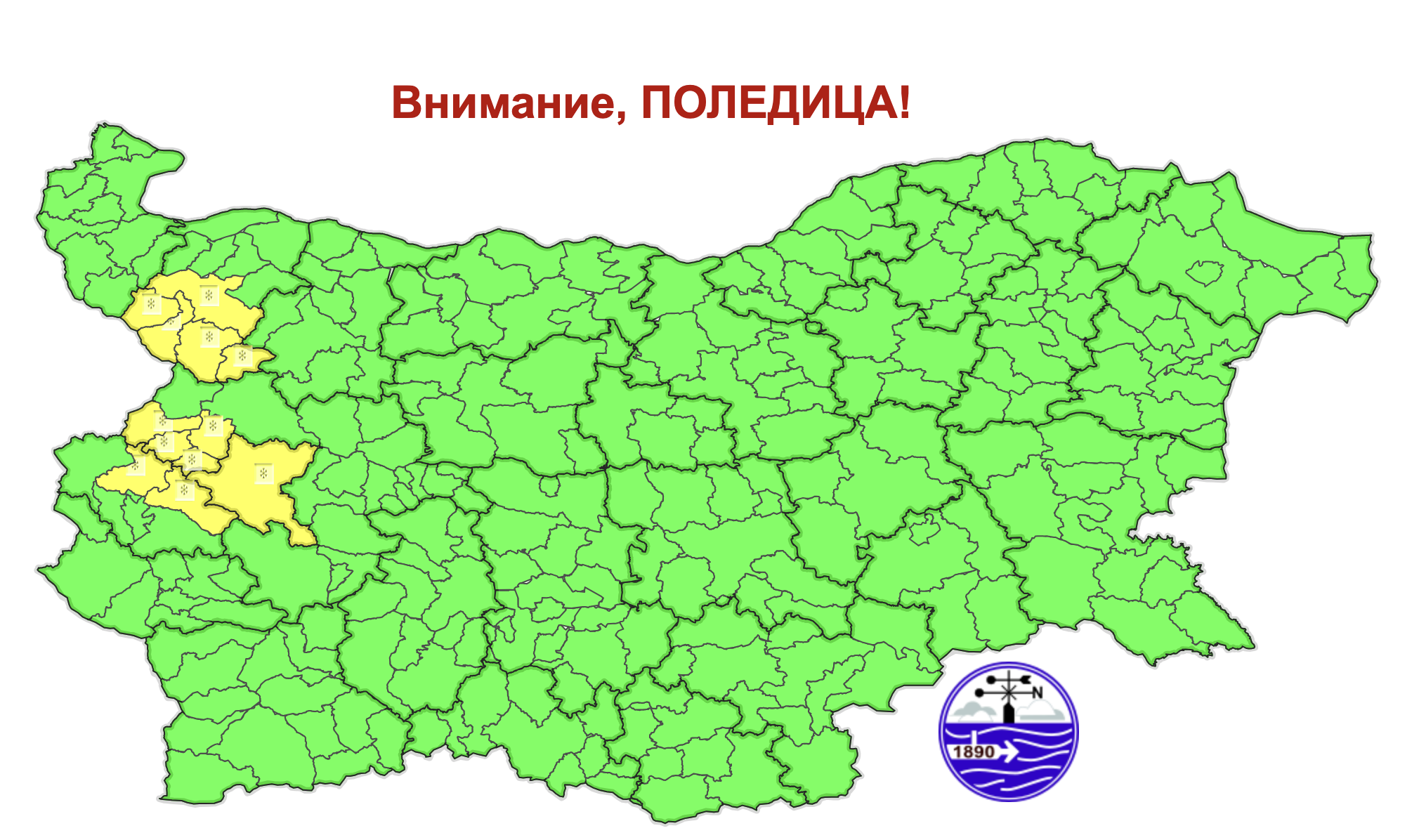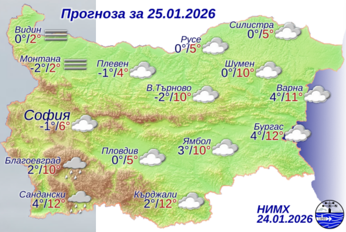 Днес ще бъде облачно. До обяд в равнините и низините ще се задържи мъгливо. На отделни места в западната част от страната ще има ръмеж, което ще създаде условия за поледица. Минималните температури ще бъдат между минус 1° и 4°, в северозападните райони и Предбалкана – до минус 3°, за София – около минус 1°.