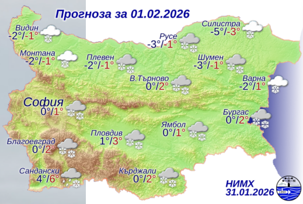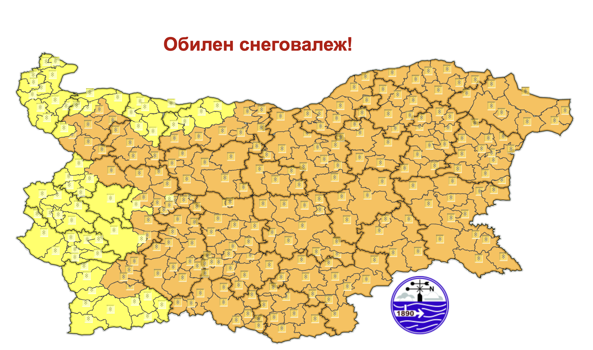 Днес сутринта от югозапад ще започнат валежи от сняг, които до вечерта ще обхванат цялата страна и в повечето райони ще са интензивни и значителни по количество. Вечерта и през нощта срещу понеделник интензивни снеговалежи ще има и в Североизточна България. Ще се образува снежна покривка, в Южна България достигаща 15-20 cm, а в Северна – до 10-15 cm. Ще духа умерен, в Източна България временно силен североизточен вятър, с който ще нахлува студен въздух. Ще има снежни виелици и навявания. Температурите ще са почти без денонощен ход, предимно между минус 3° и 2°, в София 1°.