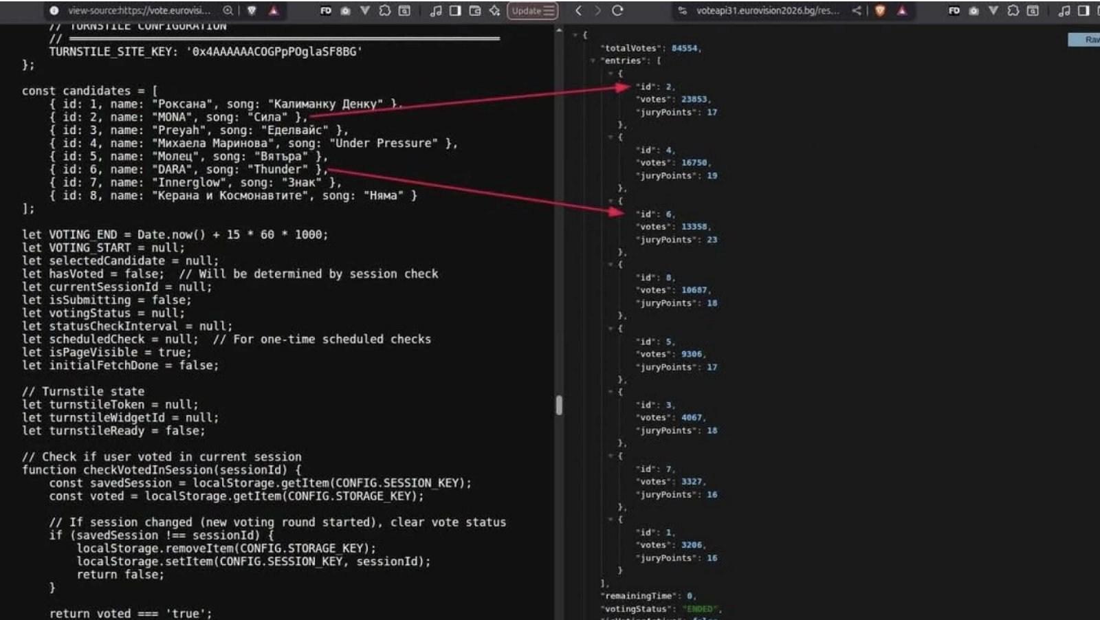 Почти веднага след края на шоуто във Фейсбук и TикТок се завъртя скрийншот от сорс кода на сайта за гласуване малко след като линиите са били затворени.