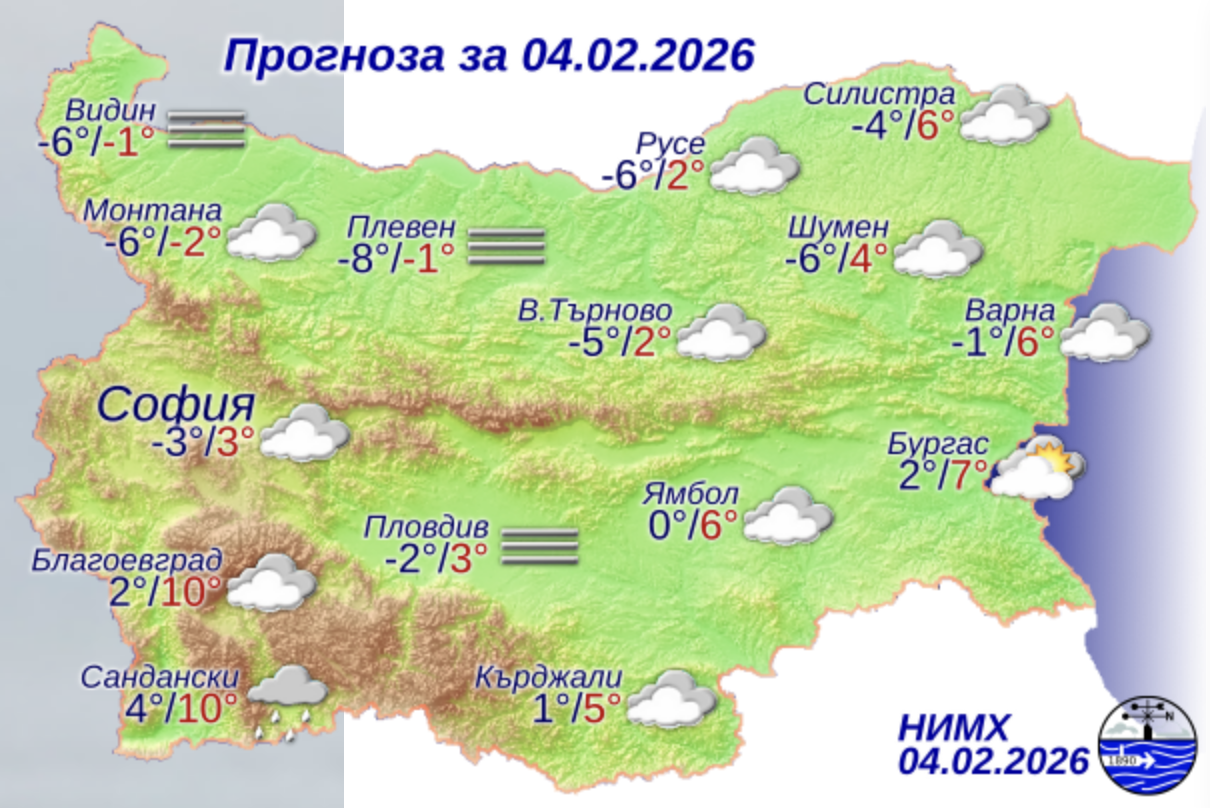 По Черноморието ще бъде предимно облачно, но без валежи. Ще духа умерен югоизточен вятър. Максималните температури ще бъдат 6°-8°. Температурата на морската вода е 5°-7°. Вълнението на морето ще бъде 2-3 бала.