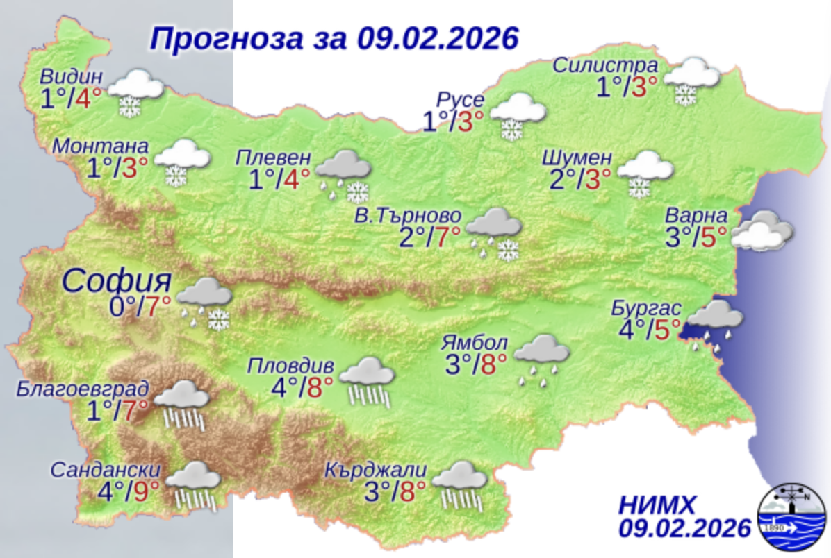 Сутринта и през деня ще бъде облачно. На отделни места в Дунавската равнина и Източна България ще е мъгливо. Минималните температури ще бъдат между 0° и 5°, за София – около 0°. Вятърът още сутринта ще се ориентира от изток-североизток и в страната ще започне да нахлува студен въздух. В началото на деня дъжд ще превалява в североизточните райони. Около обяд валежите ще обхванат почти цялата страна. Дъждът ще преминава бързо в сняг и след обяд сняг ще вали в Предбалкана, северозападните райони и високите полета. В Североизточна България около и след обяд преваляванията от сняг ще започнат да спират. Ще духа умерен, а в Дунавската равнина и източните райони и временно силен вятър от изток-североизток. Температурите около 14 ч. ще бъдат между 3° и 8°, за София – около 7°.