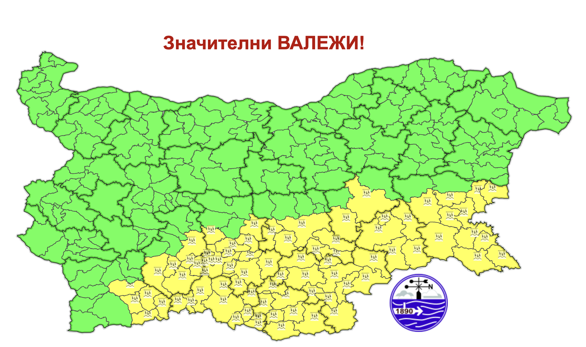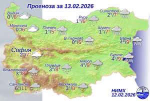 Днес ще бъде облачно. Сутринта дъжд ще вали в южните райони. Валежите ще обхванат по-голямата част от страната. Значителни по количество ще бъдат те на много места в южните райони. В югоизточните части от страната ще има и гръмотевична дейност. Ще духа до умерен, в източните райони временно силен вятър от север-североизток, в Дунавската равнина – от запад. В повечето места максималните температури ще бъдат между 5° и 10°, за София – около 7°.