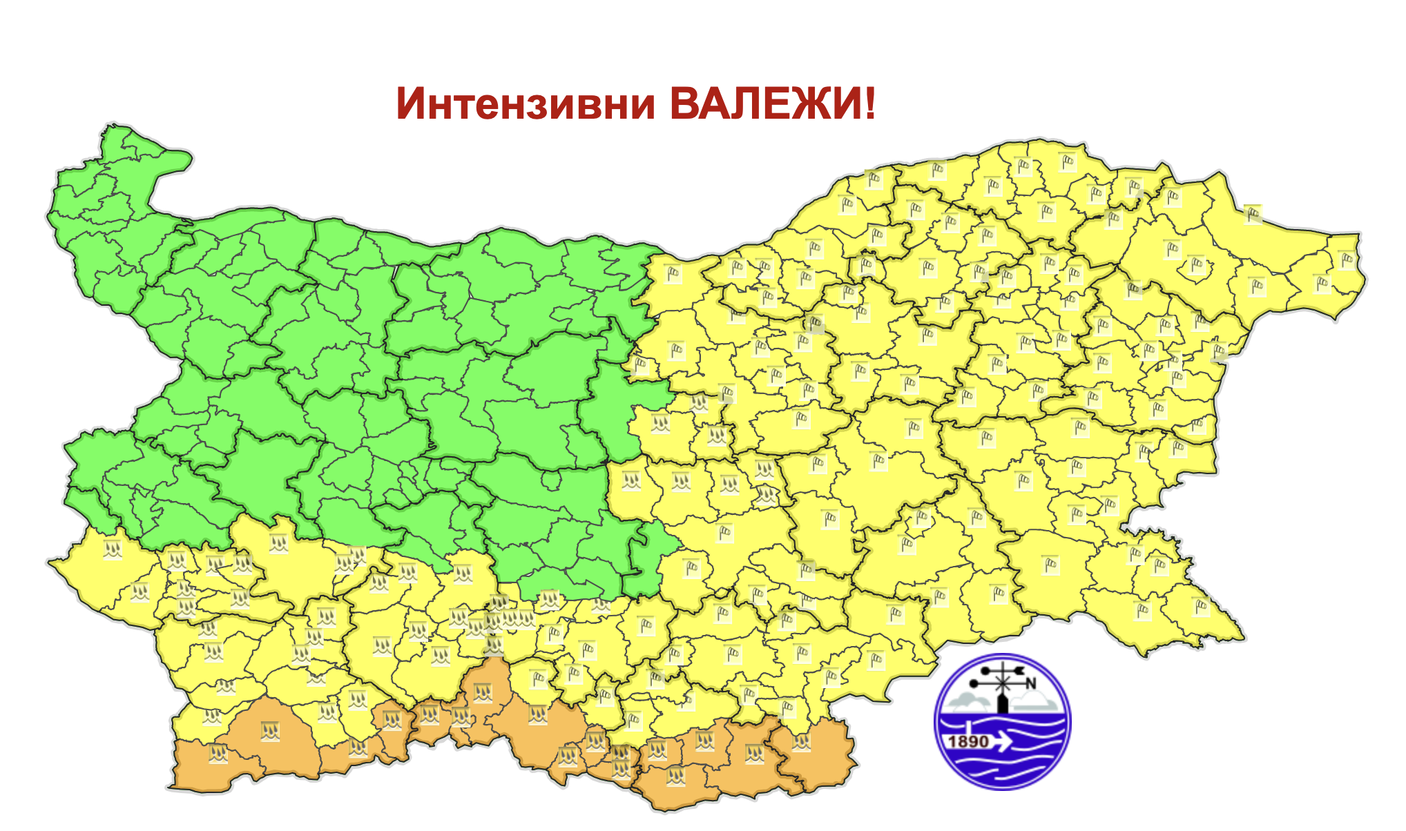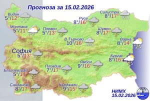 Днес облачността над страната ще е предимно значителна. Ще има краткотрайни, временно интензивни валежи от дъжд, на места главно в южните и източните райони значителни по количество и с гръмотевици. Вятърът ще бъде от юг-югозапад, умерен; в Източна България и районите разположени близо до северните планински склонове – силен и поривист. По-късно през деня ще отслабне, ще се ориентира от северозапад и с него ще започне да прониква студен въздух. Минималните температури ще са между между 5° и 10°, в София – около 5°. Максималните температури ще бъдат между 12° и 17°, по-високи в местата чувствителни на южен вятър, а в София – около 13°.