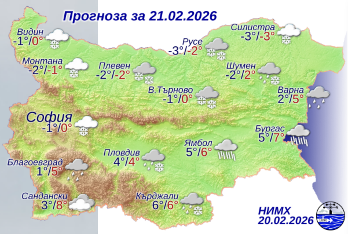 По Черноморието ще бъде облачно с валежи от дъжд, които към края на денонощието ще преминават в сняг. На места, главно по северното крайбрежие, ще има условия за поледици. Ще духа силен вятър от север-североизток. Максималните температури ще бъдат между 4° и 7°. Температурата на морската вода е 4°-6°. Вълнението на морето ще бъде 3-4 бала.