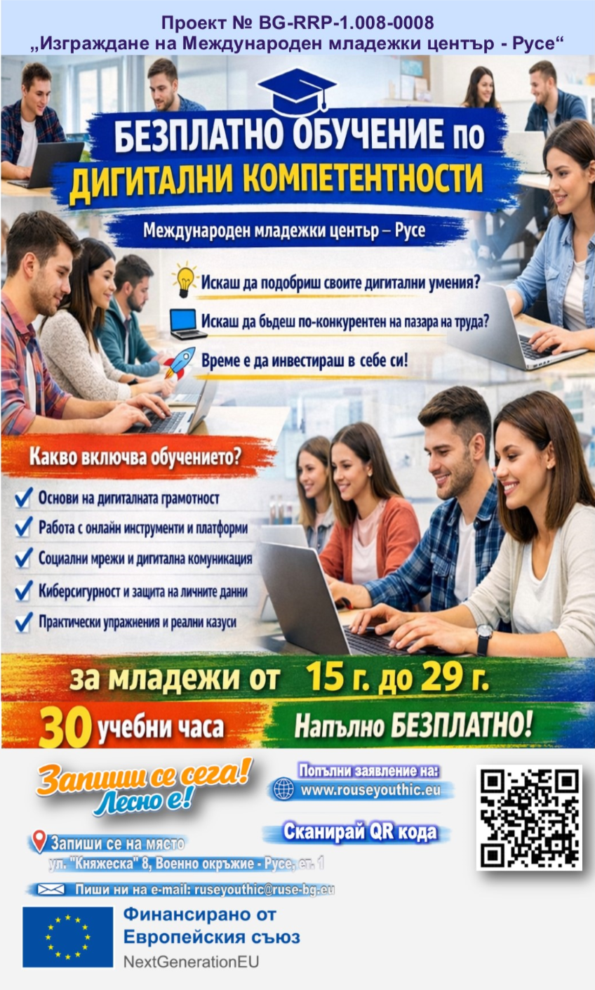 Дейностите се извършват по проект № BG-RRP-1.008-0008 „Изграждане на Международен младежки център – Русе“.