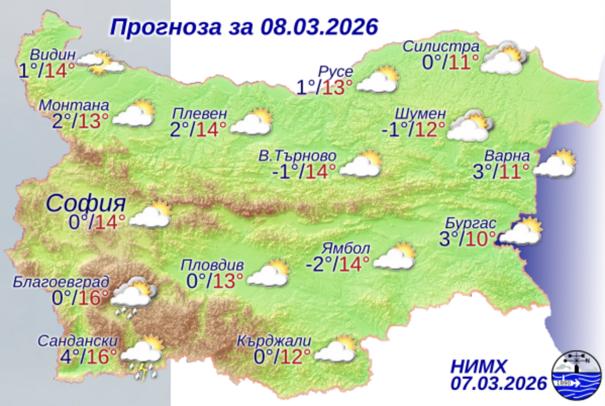 Сутринта високата облачност ще се увеличава и над източните райони. Ще бъде почти тихо. На отделни места в низините и котловините ще има намалена видимост. Минималните температури ще бъдат между минус 2° и 3°, за София – около 0°. През деня ще преобладава слънчево време. След обяд над югозападните и планинските райони ще се развива купеста облачност. На отделни места там ще превали дъжд, по най-високите части на Рила и Пирин – сняг. Ще духа слаб до умерен вятър от изток-североизток. Максималните температури ще бъдат между 10° и 15°, за София – около 14°.