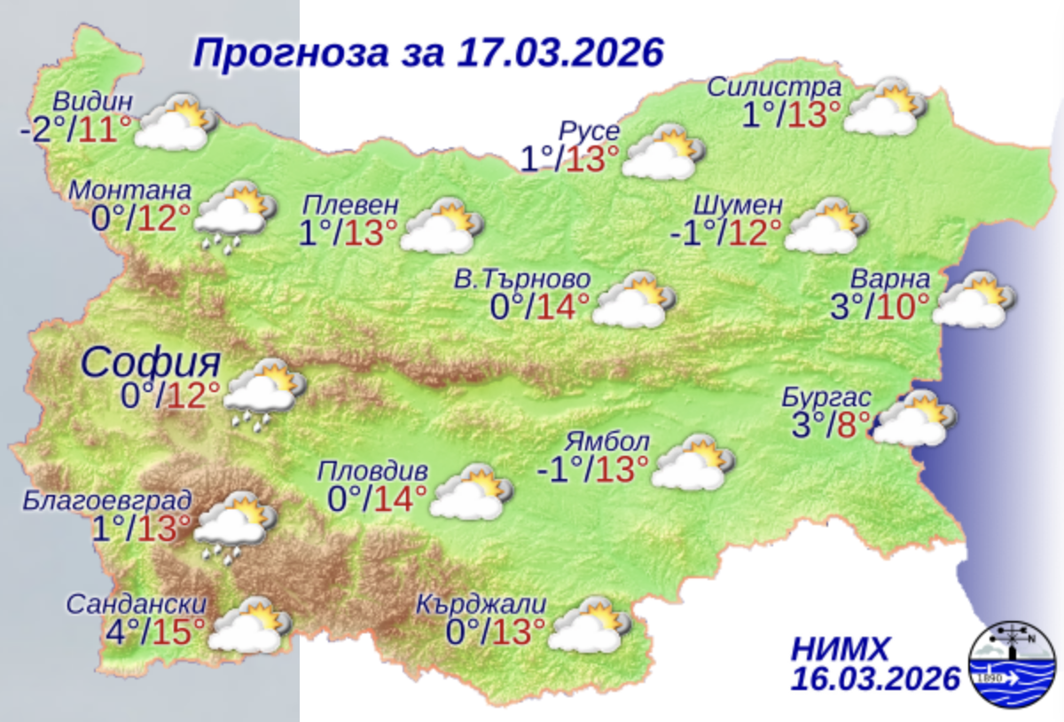 Днес над по-голямата част от страната облачността ще бъде значителна. В следобедните часове на места, главно в планинските райони на Западна България, ще има превалявания от дъжд, а по високите планински части – от сняг. Ще духа умерен източен вятър. Максималните температури ще бъдат между 10° и 15°, за София – около 12°.