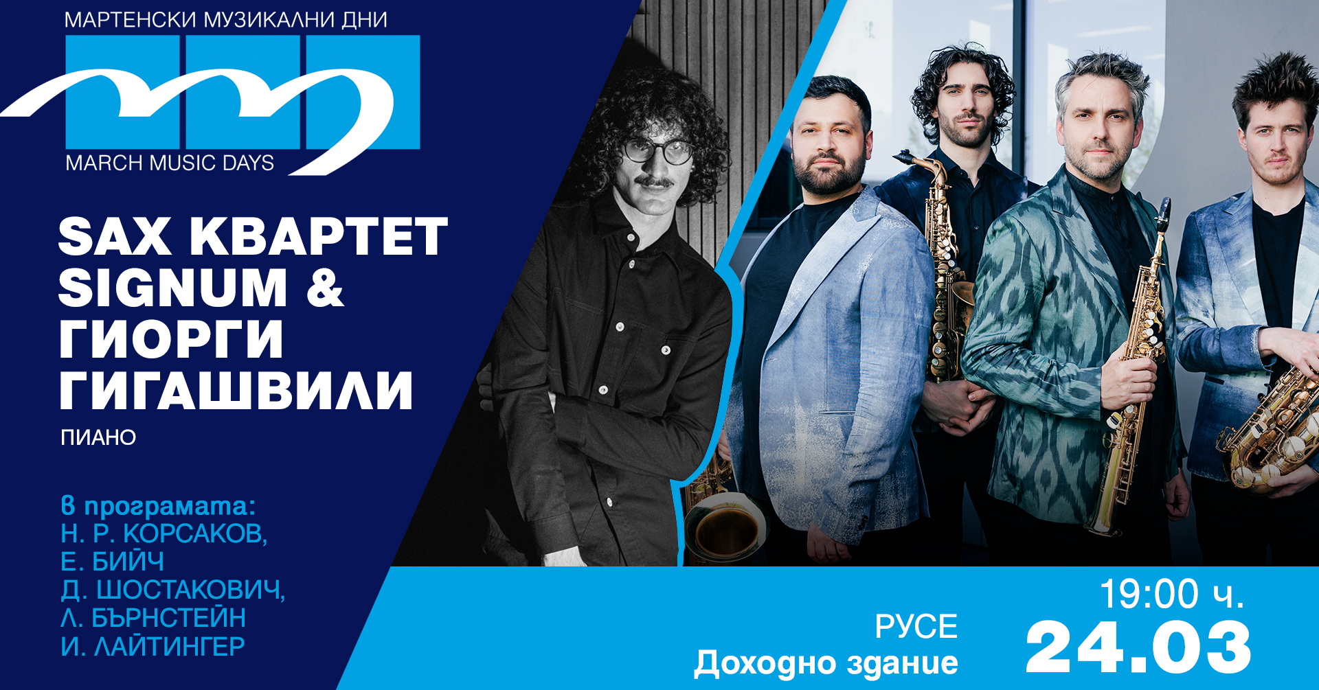 Програмата продължава на 24 март с гостуването на немския саксофонен квартет „SIGNUM“ – формация, известна със своята експлозивна енергия и новаторски дух. Поради заболяване на планирания солист Гиорги Гигашвили, музикантите ще представят самостоятелно интригуващ репертоар, който превежда слушателя през ефирния свят на Едвард Григ, класическото съвършенство на „Американския квартет“ от Дворжак и завладяващите ритми на Гершуин и Бърнстейн със симфоничните танци из „Уестсайдска история“. „SIGNUM“ обещават да преобърнат представите за възможностите на саксофона, превръщайки го в глас на модерната класическа сцена.