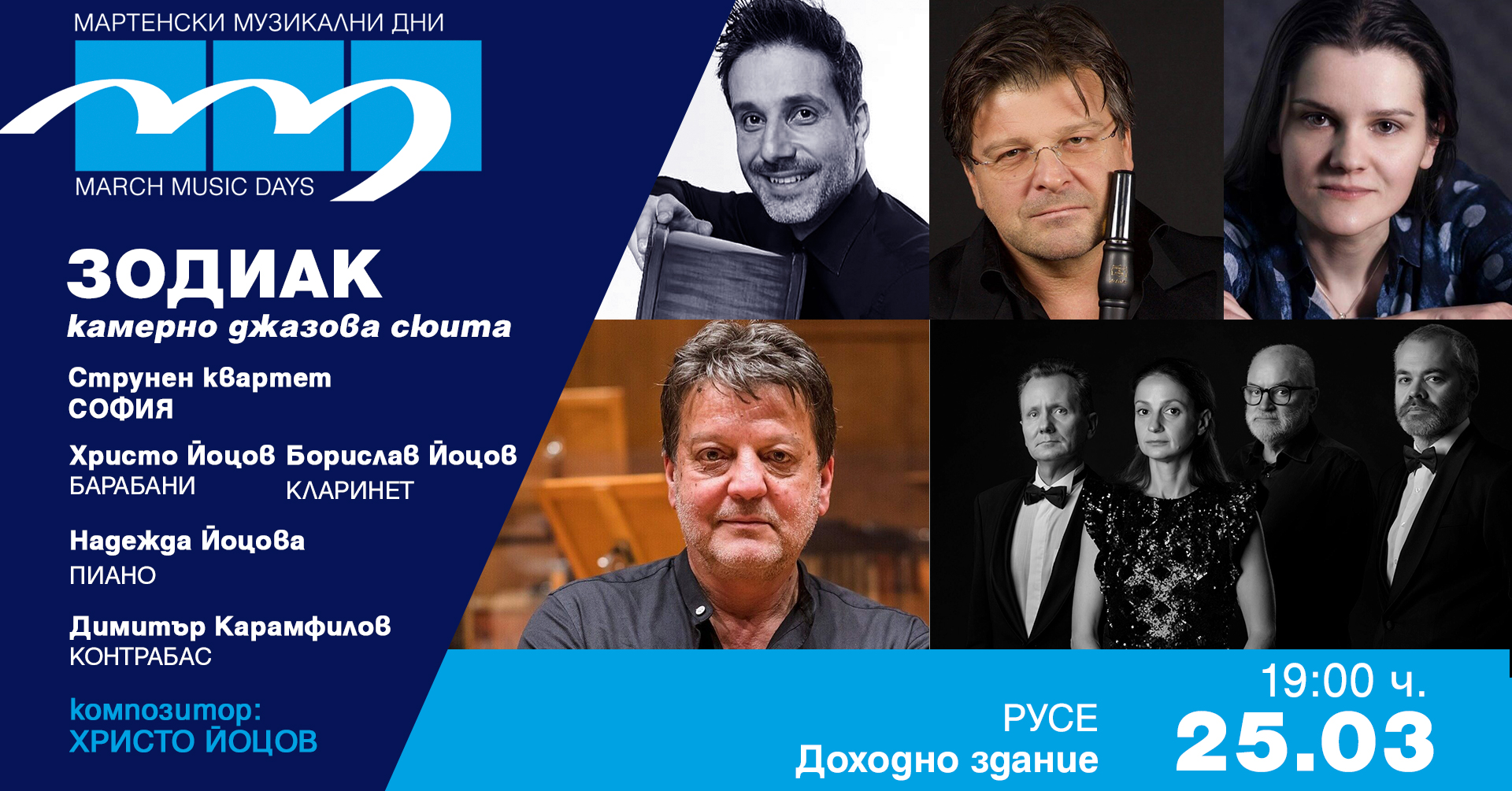 Кулминацията на този тридневен цикъл е на 25 март с премиерния проект „Зодиак“ на известния джаз музикален визионер Христо Йоцов. Камерно-джазовата сюита е замислена като вдъхновяващо музикално писмо до японския писател Харуки Мураками и представлява пътешествие през дванайсетте зодиакални знака. Проектът постига уникална симбиоза между джаз трио и струнния квартет „София“, обединявайки на сцената изключителни инструменталисти като Борислав Йоцов, Надежда Йоцова и Димитър Карамфилов. Всяка от дванадесетте пиеси разкрива различно настроение – от дълбока лиричност до експлозивна енергия, затвърждавайки репутацията на фестивала като пространство за творческа свобода и експеримент.