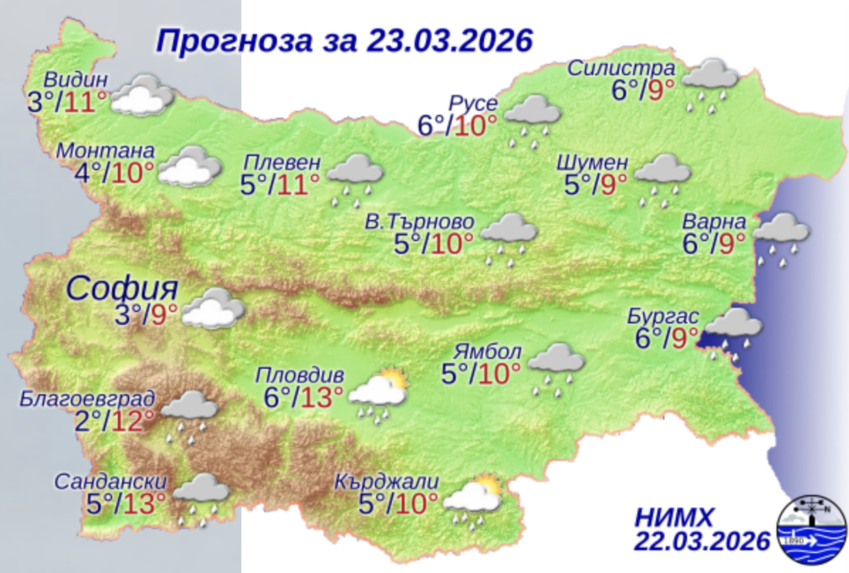 Днес над страната облачността ще бъде значителна. През първата половина на деня в Източна България ще има превалявания от дъжд. Главно след обяд дъжд ще превалява на много места и в централните части на Северна България, Горнотракийската низина и югозападните райони, а в планините – слаб сняг. Ще духа слаб, в Източна България умерен вятър от север-североизток. Максималните температури ще бъдат между 8° и 13°, за София – около 9°.