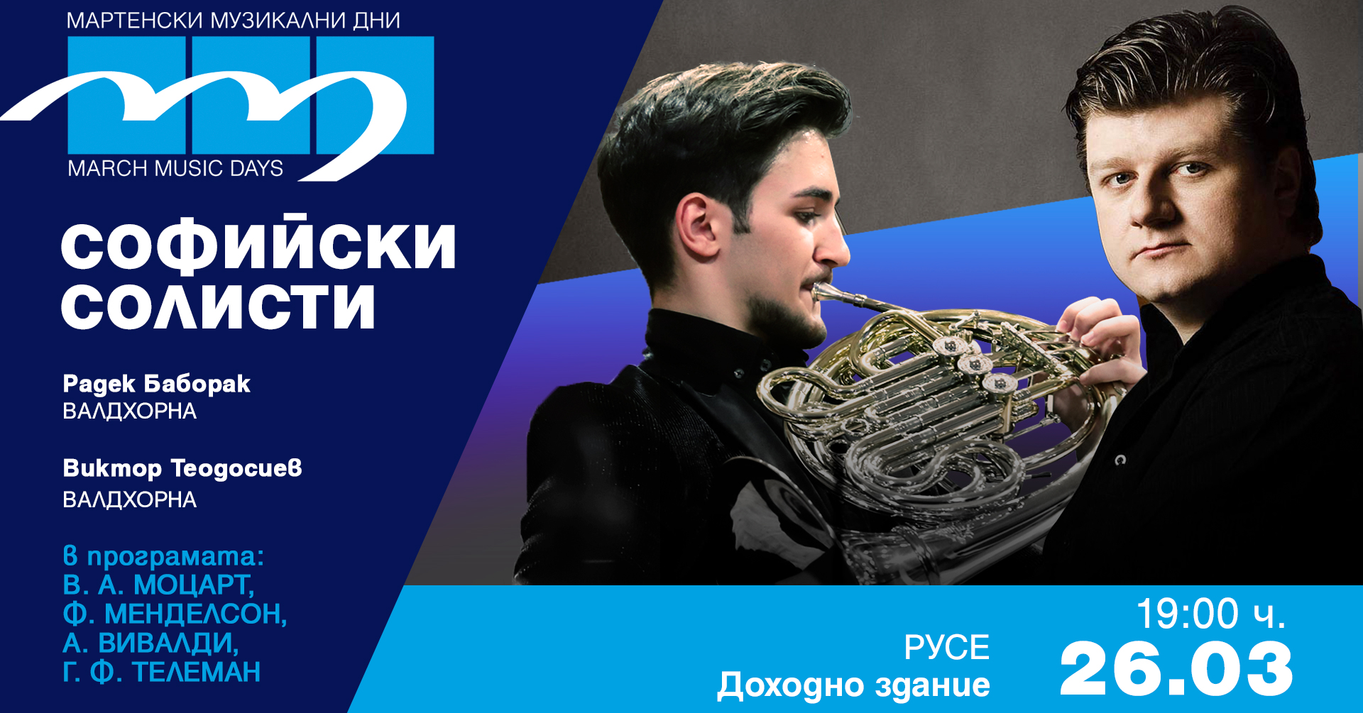 На 26 март 65. Международният фестивал „Мартенски музикални дни“ ще предложи на публиката изтънченото съвършенство на класиката с проекта „270 години от рождението на В. А. Моцарт“ в изпълнение на легендарния камерен ансамбъл „Софийски солисти“. В центъра на вечерта е диалогът между две поколения виртуози на валдхорната – световно признатия чешки майстор и диригент Радек Баборак и изгряващата българска звезда Виктор Теодосиев.