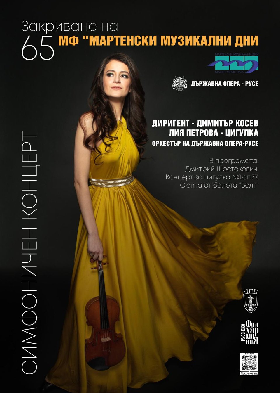 Фестивалът ще бъде закрит на 29 март с концерт на оркестъра на Държавна опера – Русе под диригентството на Димитър Косев. Солист в празничната вечер ще бъде световноизвестната цигуларка Лия Петрова, която ще интерпретира Концерт за цигулка №1 на Шостакович.