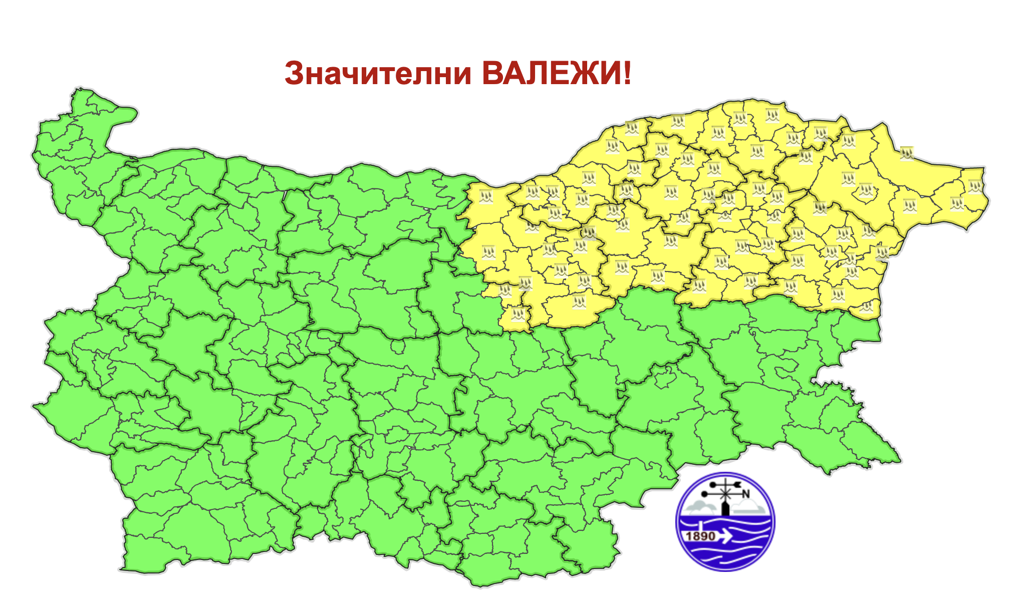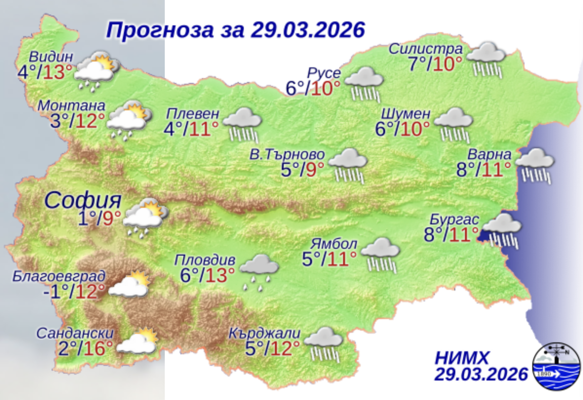 През настоящето денонощие времето ще се задържи предимно облачно. На много места ще има валежи, по-интензивни и значителни ще са през деня в Североизточна България. Разкъсвания и временни намаления на облачността ще има главно над югозападните райони. През нощта и в сутрешните часове на места в Предбалкана и високите западни полета ще превали слаб сняг. Ще духа слаб, през деня умерен северозападен вятър. Минималните температури ще бъдат между 2° и 7°, по-ниски в югозападните райони, максималните в повечето места ще бъдат между 9° и 14°. В София минималната температура ще бъде около 1°, максималната – около 9°.