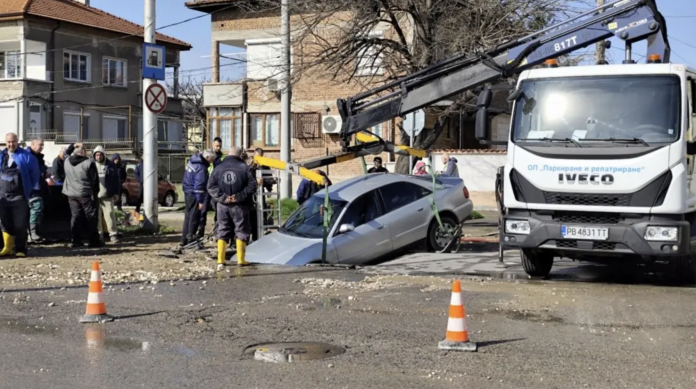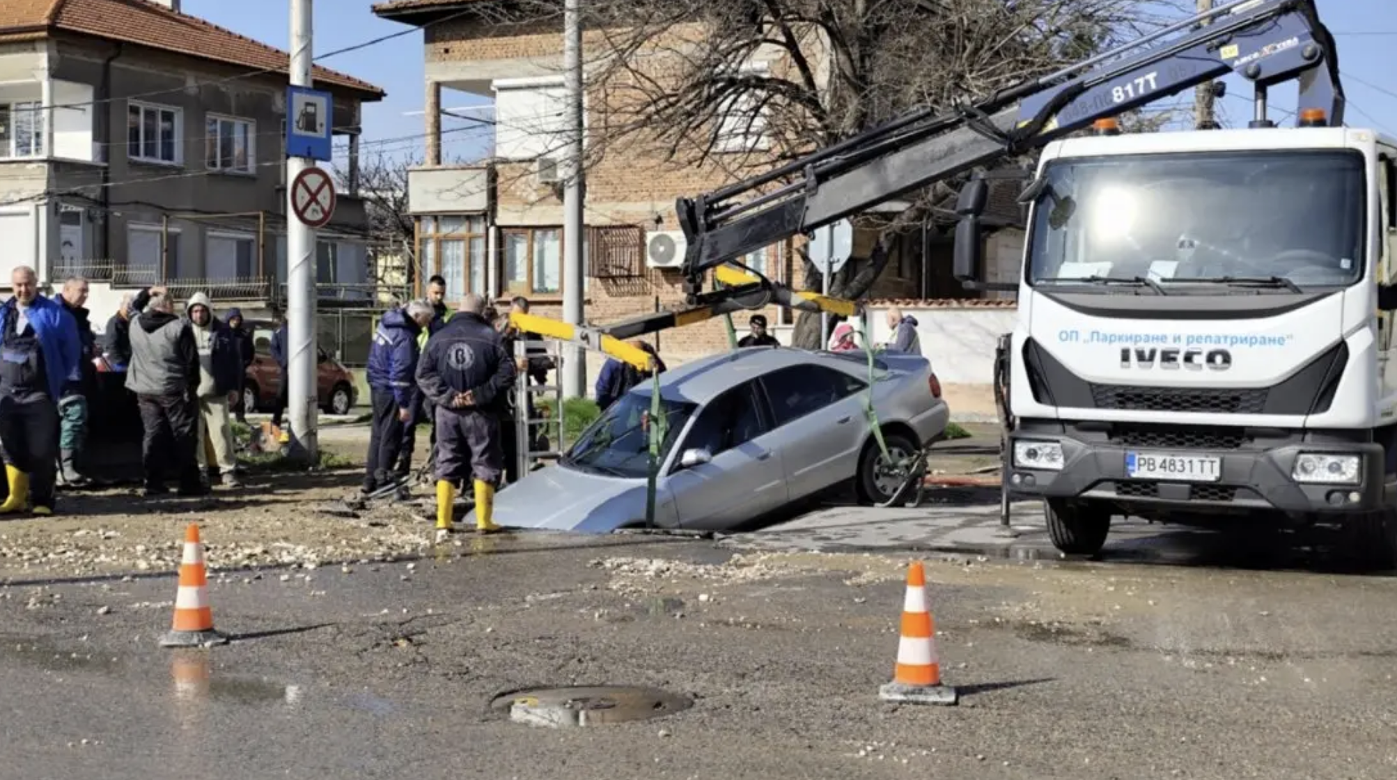Кола пропадна в дупка, образувана от ВиК авария в пловдивския квартал „Столипиново“. При инцидента на ул. „Ландос“ няма пострадали.