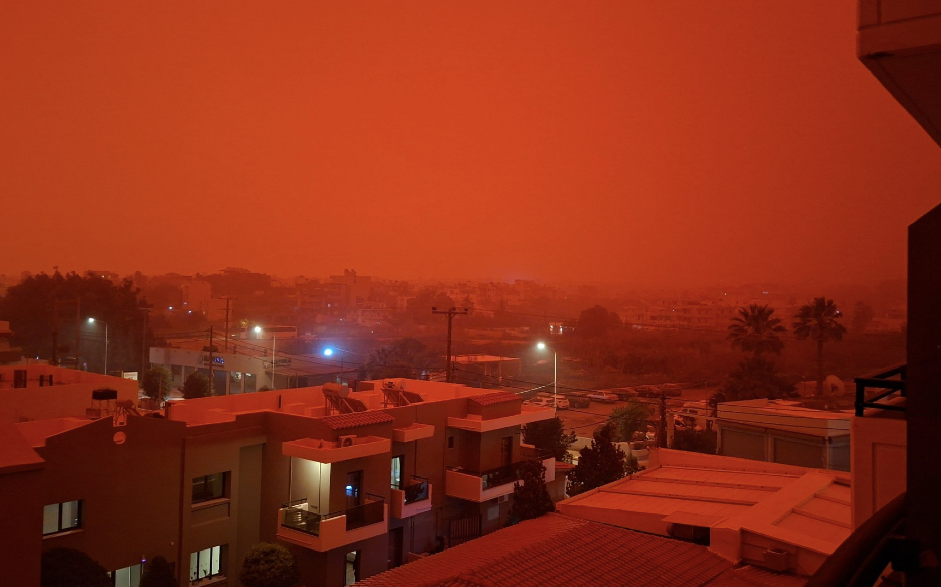 Рекордно количество прах от Сахара обгърна най-големия гръцки остров Крит. Плътна оранжево-червена мъгла сведе видимостта в много райони до под 500 метра, а концентрацията на фини прахови частици достигна опасните 1000 микрограма на кубичен метър – нива, надвишаващи 20 пъти нормите на Световната здравна организация.