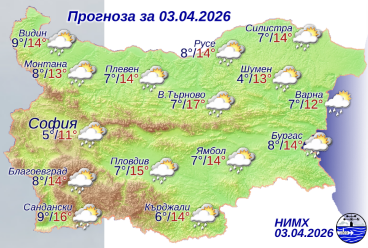 Днес ще се задържи предимно облачно и на много места ще има валежи от дъжд. Вятърът ще бъде слаб от изток-североизток. Дневните температури ще се повишат и максималните ще са между 11° и 16°, в София – около 11°.
