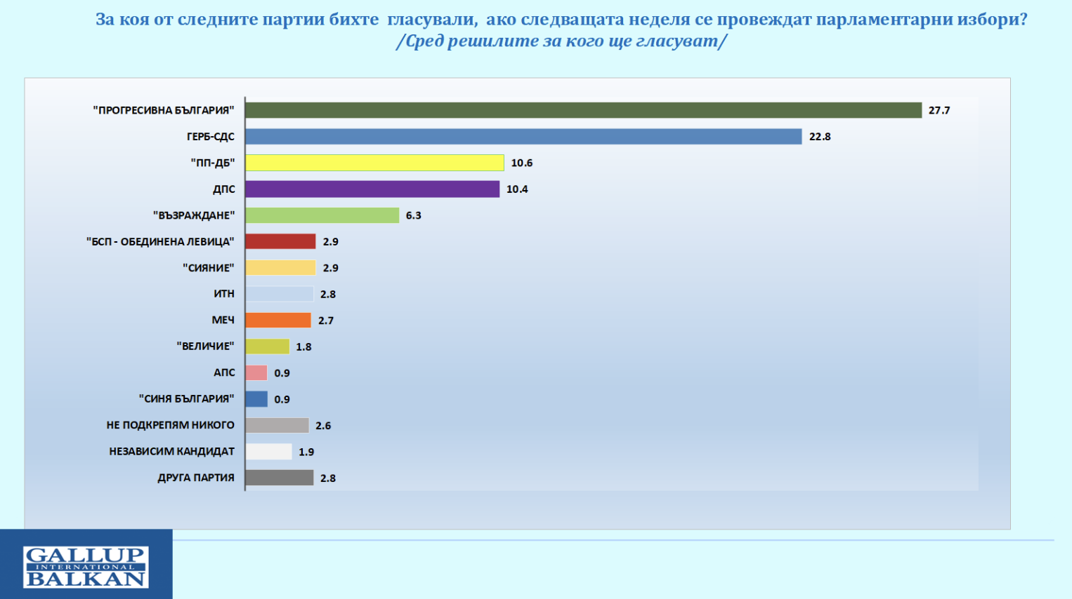 Данните сочат, че първа политическа сила е „Прогресивна България“ – 27,7%. В сравнение с регистрираните 29,8% в проучването от февруари, се забелязва известен спад, но това все още не дава основания да се смята, че е налице устойчива тенденция.