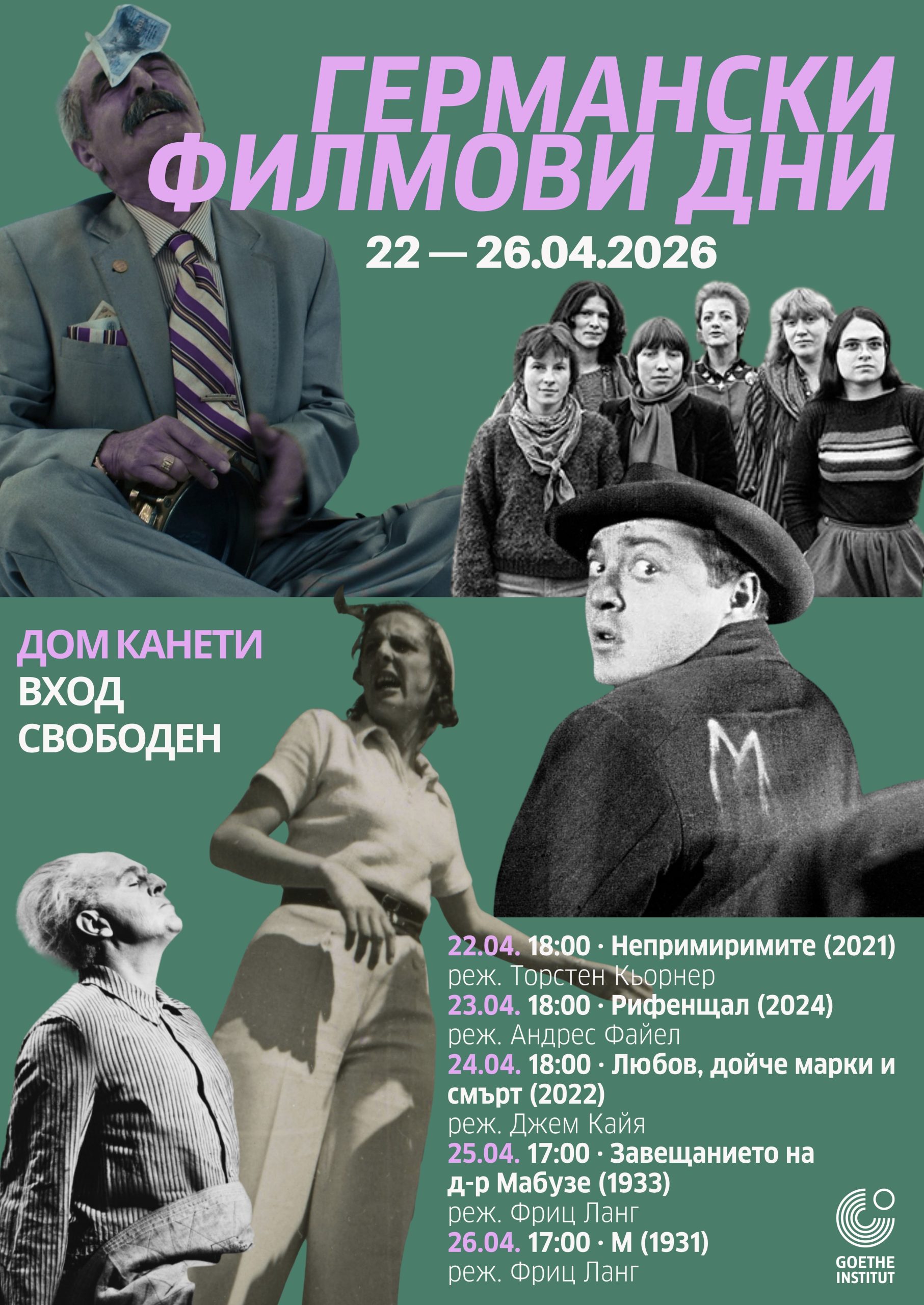 В последните дни на април  Гьоте институт – България в партньорство с МД“Елиас Канети“ представя  Германски филмови дни.  В тях са включени три документални филма, произведени през последните четири години, посветени на културно-исторически теми. Всеки от тях, макар и с различна тематика, дава детайлен и критически поглед върху близкото минало. В събота и неделя публиката ще може да види за първи път или да си припомни  две филмови класики от 30-те години на 20-ти  век на режисьора Фриц Ланг (1890-1976).  Творил в  Германия и САЩ, той оставя дълбока следа в историята на киното от Ваймарската република  като поставя нови естетически и технически стандарти.