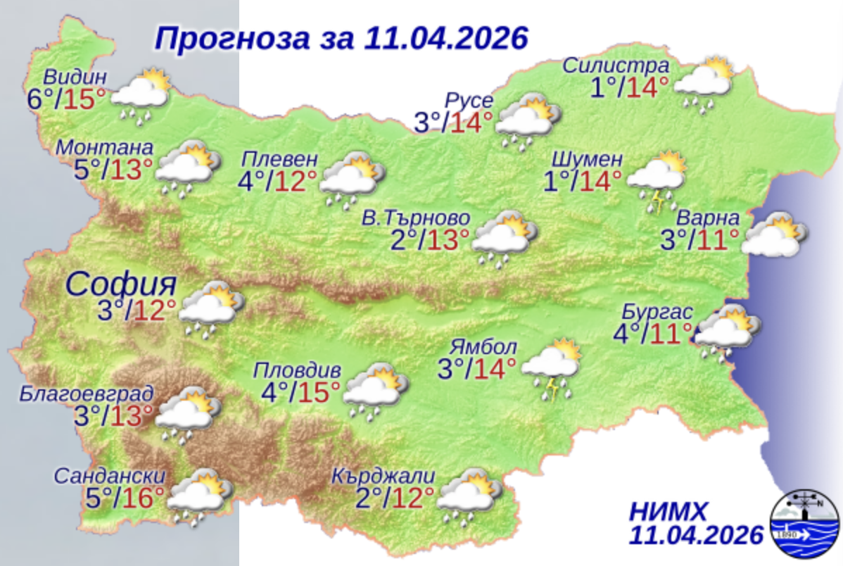 Днес над по-голямата част от страната облачността ще бъде значителна. На места ще има валежи от дъжд, в планините – от сняг. В Източна България валежите ще бъдат придружени с гръмотевици. Ще духа до умерен вятър от запад-северозапад, в източните райони – от юг-югоизток. Максималните температури ще бъдат между 11° и 16°, за София – около 12°.