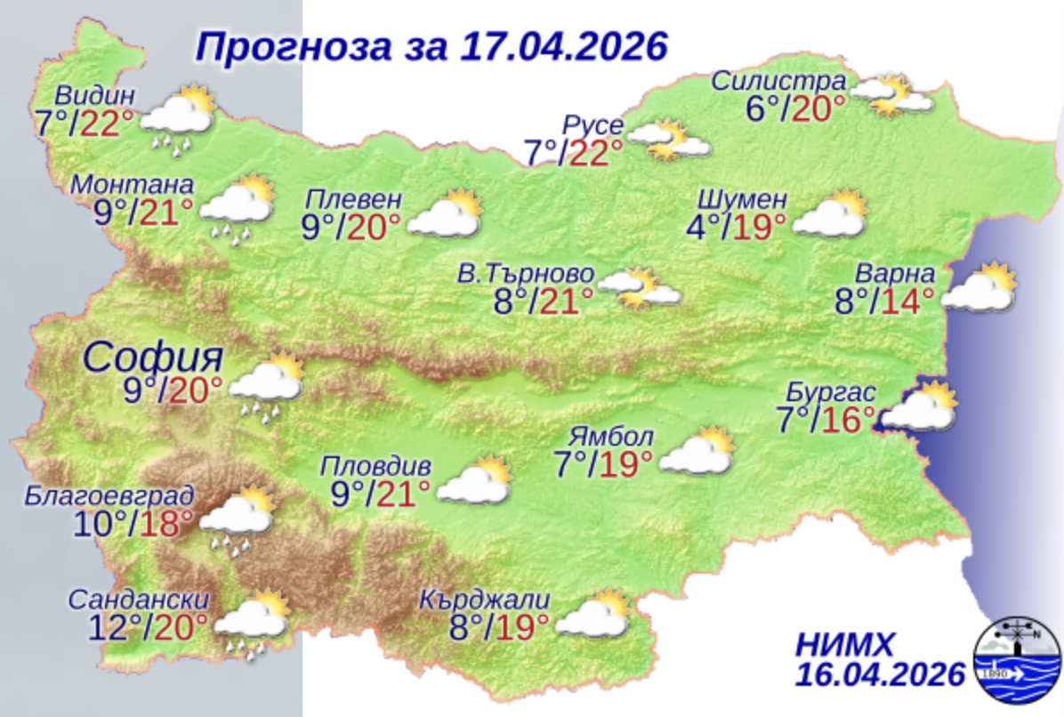 Днес облачността над страната ще се разкъсва, по-често значителна ще е над Южна България и на отделни места в югозападните райони ще има превалявания от дъжд. След обяд от северозапад ще започне ново увеличение на облачността и ще започнат валежи от дъжд. Ще духа слаб до умерен вятър от изток-североизток. Максималните температури ще бъдат между 17° и 22°, по-ниски по Черноморието, а в София – около 20°.