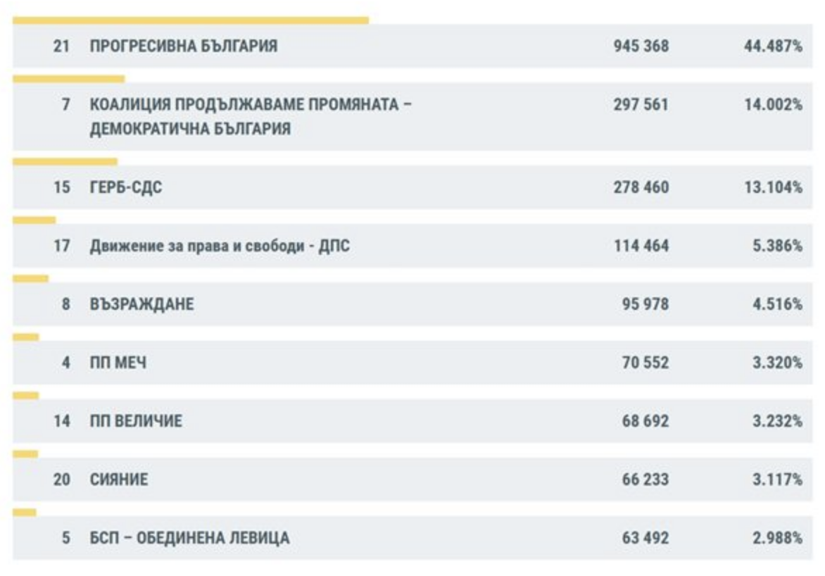 „Прогресивна България“ на бившия президент Румен Радев взема 44.487% на извънредните парламентарни избори и води убедително за новия парламент. Това показват официалните данни на Централната избирателна комисия при 68,34% преброени протоколи от секционните комисии.