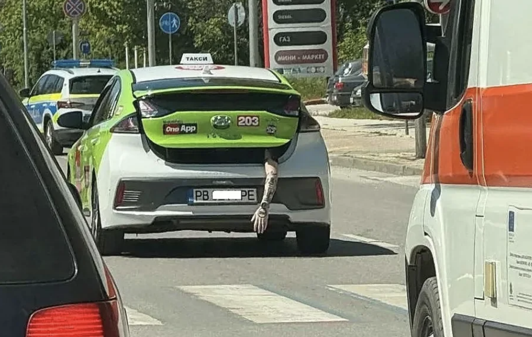 На снимката се вижда човешка ръка, висяща от багажника, който е полуотворен. Ръката е нашарена от татуировки и има часовник. Още по-фрапиращото е, че пред нея кара патрулка, а зад нея – линейка, предаде агенция БЛИЦ.