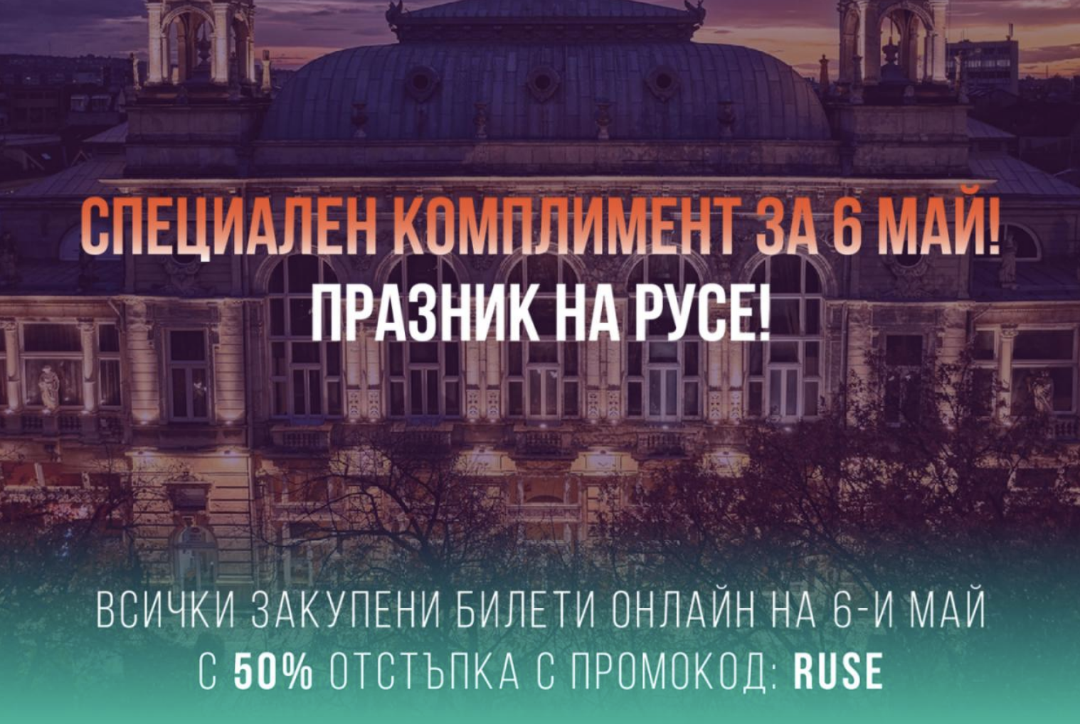 Само на 6 май и само при онлайн покупка на билети, зрителите ще могат да се възползват от 50% отстъпка за спектаклите от майската програма на театъра. Намалението ще бъде активно само 24 часа с промокод: RUSE. По този начин благодарим на своята вярна публика и каним повече хора да споделят магията на живото изкуство в празничния месец.